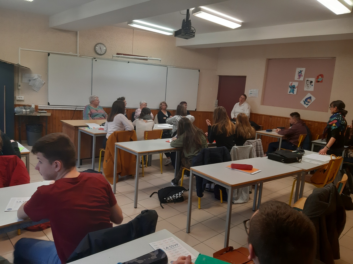 Dans le cadre de la co-intervention, Mme COUSIN, Mme PROVENZANO et les élèves de la classe de 2de ASSP ont eu le plaisir d'accueillir des résidentes de chez Domitys et deux bénévoles de l'association Saint-Vincent-de-Paul.