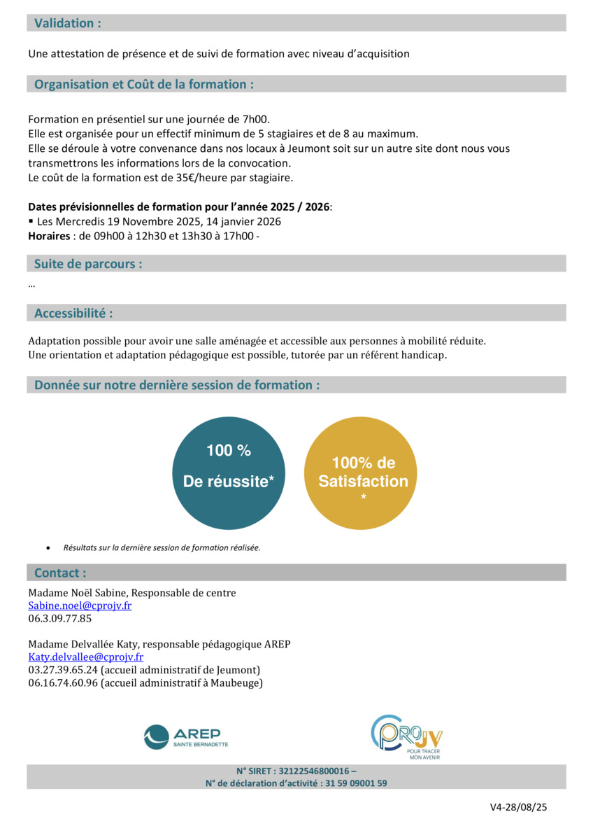 Sur simple demande auprès du centre de formation, envoi de la plaquette et ou un devis.